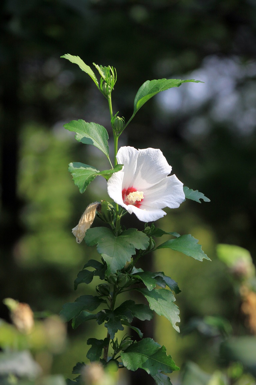 무궁화의 잎은 길쭉하고 둥근 형태를 가지고 있으며, 나무 전체적으로 부드러운 느낌을 줘요. 이 꽃은 낮 동안 피었다가 저녁이 되면 시드는 특징을 가지고 있어, 짧지만 강렬한 생명력을 보여줍니다.